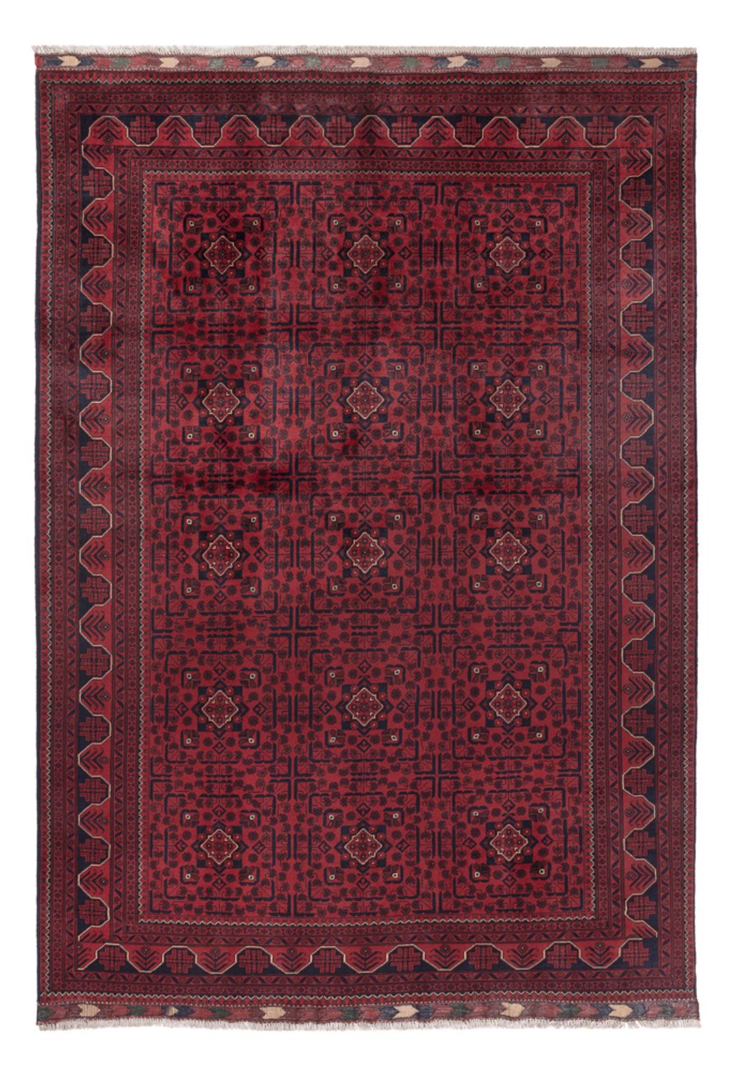 Der wunderschöne Afghan Teppich – Kunduz ist ein echter Khal Mohammadi und begeistert durch seine satten Farben und die atemberaubende Musterung. Diese Teppiche werden in Afghanistan auf Dörfern und in Werkstätten von Hand geknüpft. Afghan Teppiche sind wegen ihrer schönen roten Farbschattierung berühmt. Einige Hauptmerkmale dieser Teppiche sind die wiederkehrenden Hexagone, die Rauten, die Yomut-Motive und das Muster, das mit einem Elefanten Fußabdruck gleicht. Die Wolle ist weich und damit sehr strapazierfähig. Oftmals wirkt die Wolle leicht glänzend. Seine Qualität überzeugt jeden Liebhaber orientalischer Teppiche. Ein schöner Teppich, der seinen Preis absolut wert ist.