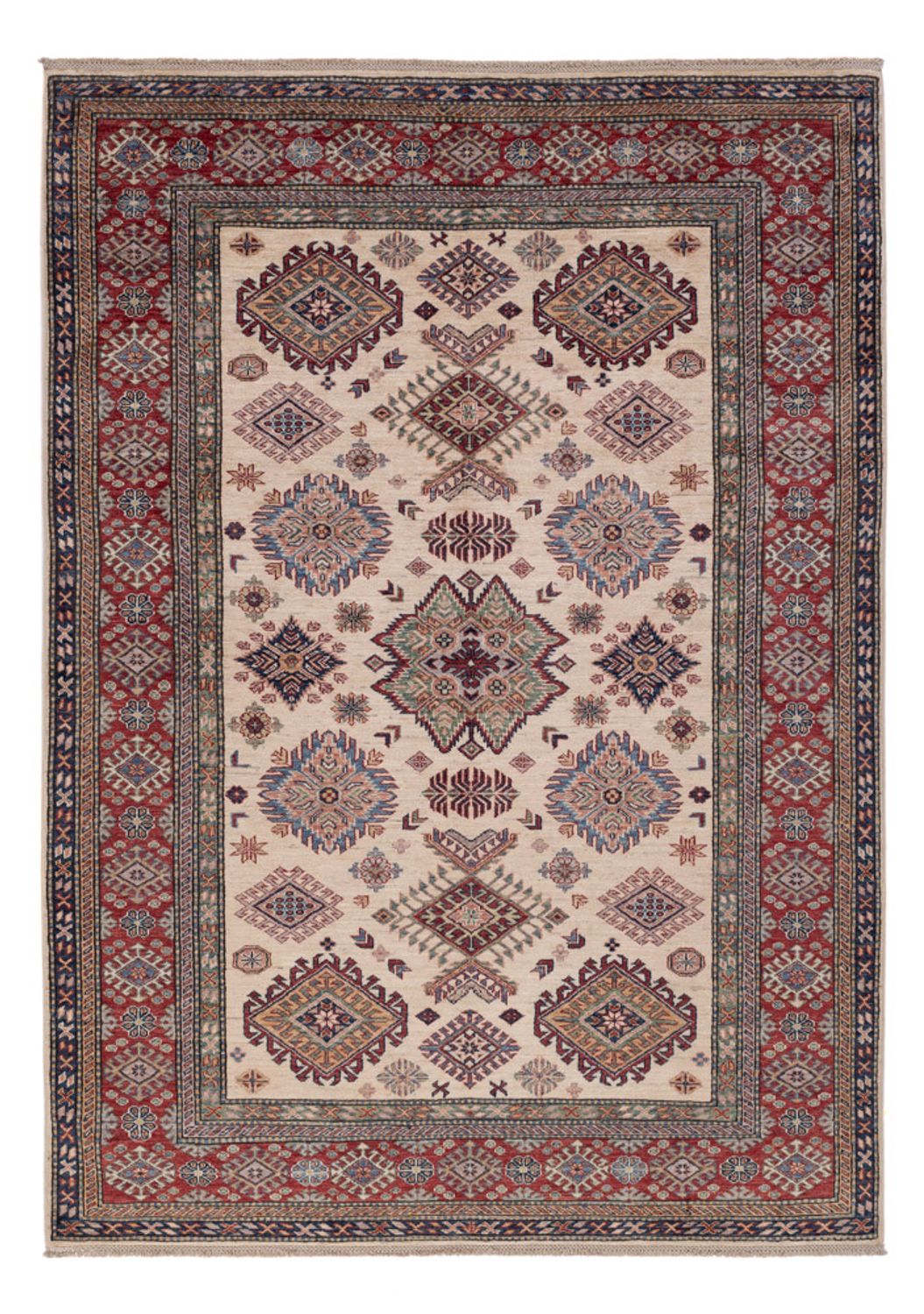 Dieser Ziegler Teppich – Kazak bringt frischen Wind in dein Zuhause! Das Knüpfgebiet der Kazak liegt im Kaukasus. Das Muster ist von geometrischen Mustern aus Russland inspiriert und die Wolle wird mit natürlichen Pflanzenfarben gefärbt. Die Teppiche sind strapazierfähig und haben kräftige Farben. Nach der Knüpfung werden sie mit Steinen gewaschen, um den besonderen glänzenden Charakter zu erzielen. Die heutigen Kazaks sind fast immer Teppiche die in Pakistan oder Afghanistan geknüpft wurden und deren Muster sich an den antiken Vorbildern des gesamten Kaukasus-Gebiets orientieren.