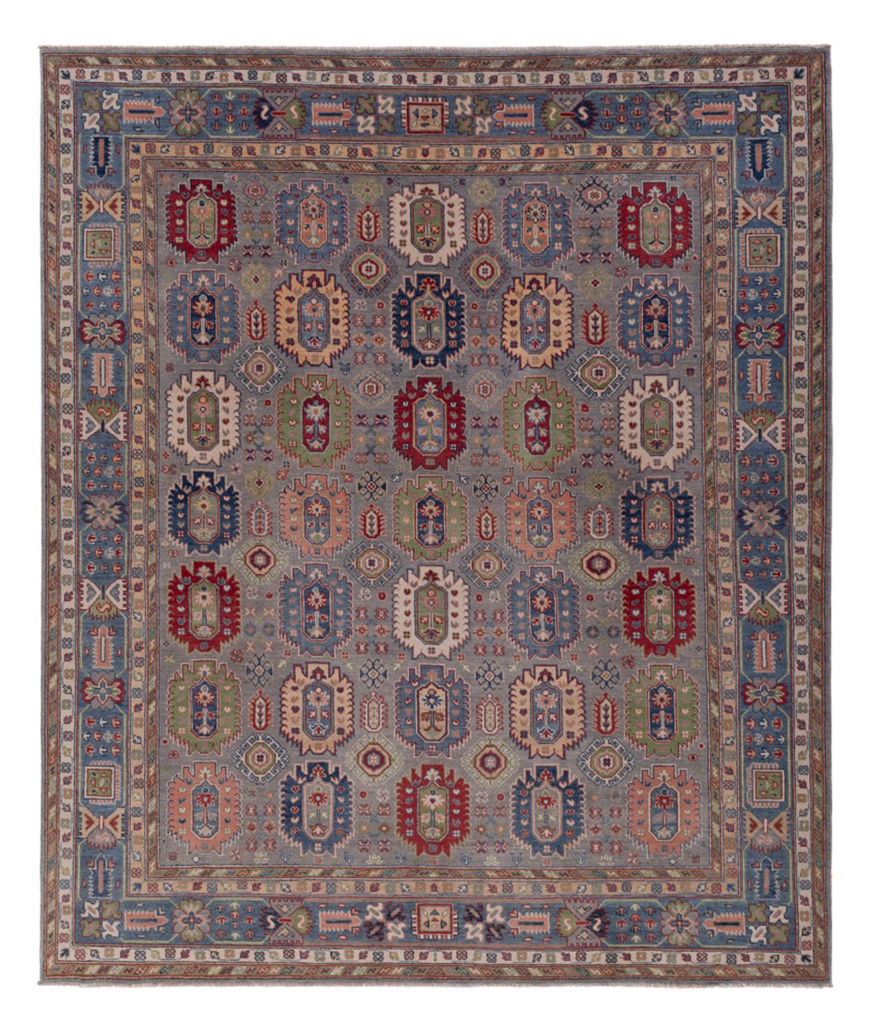 Dieser Ziegler Teppich – Kazak bringt frischen Wind in dein Zuhause! Das Knüpfgebiet der Kazak liegt im Kaukasus. Das Muster ist von geometrischen Mustern aus Russland inspiriert und die Wolle wird mit natürlichen Pflanzenfarben gefärbt. Die Teppiche sind strapazierfähig und haben kräftige Farben. Nach der Knüpfung werden sie mit Steinen gewaschen, um den besonderen glänzenden Charakter zu erzielen. Die heutigen Kazaks sind fast immer Teppiche die in Pakistan oder Afghanistan geknüpft wurden und deren Muster sich an den antiken Vorbildern des gesamten Kaukasus-Gebiets orientieren.