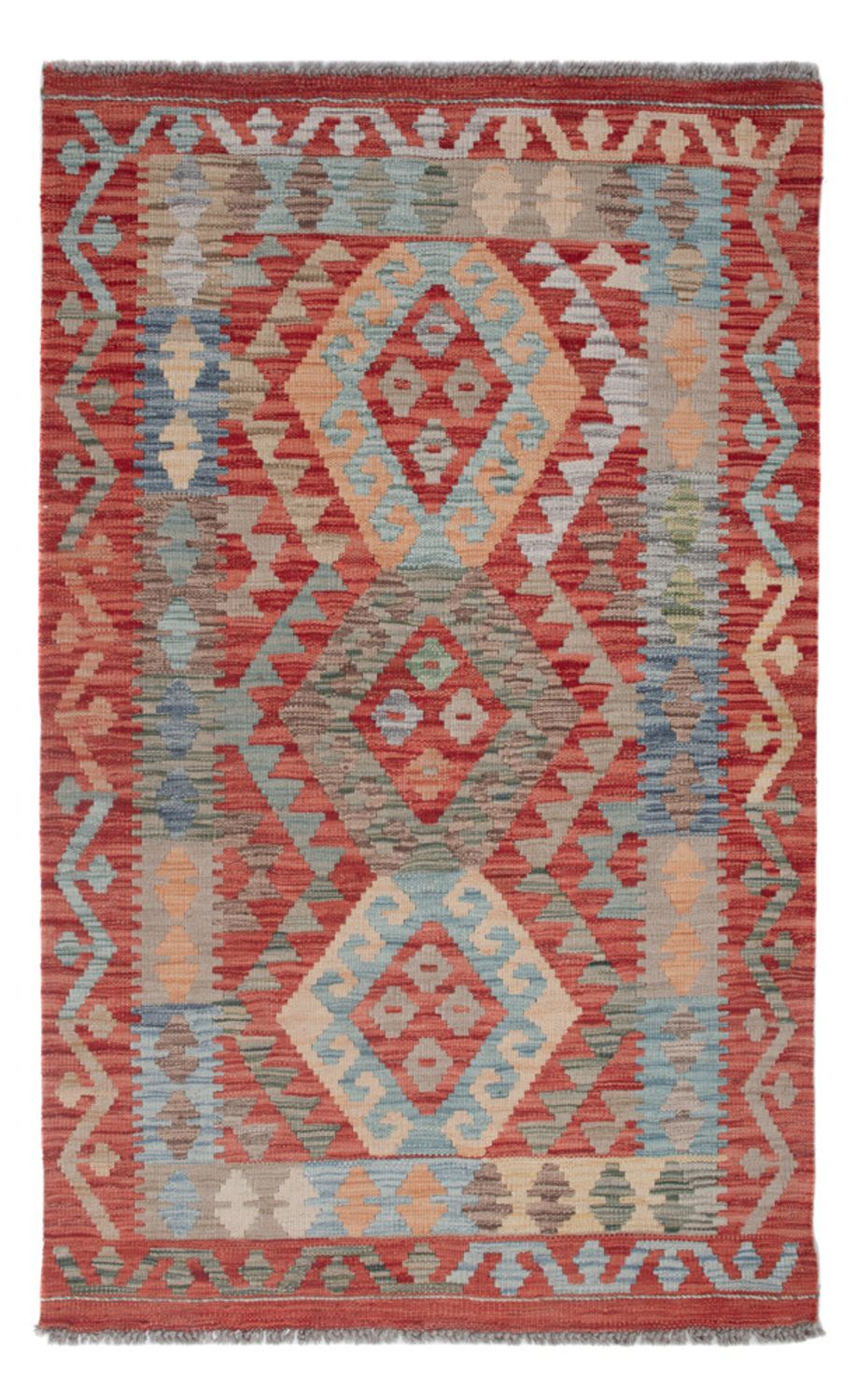 Dieser kunstvolle Kelim - Splash besticht das Auge mit seinen angesagten Farben. So bringt er eine moderne und harmonische Eleganz in Ihr Wohnambiente mit ein. Kelim Teppiche sind im Gegensatz zu klassischen Orientteppichen in traditioneller Art handgewebt statt geknüpft. In anderen Ländern werden diese Exemplare auch als Kissen oder Vorhänge genutzt. Diese Teppiche haben einen dünnen Flor, für das feste Obergewebe wird 100% Schurwolle verwendet, welche von Natur aus äußerst pflegeleicht und strapazierbar ist. Als echten Kelim bezeichnen Experten nur Teppiche, welche in der Türkei, dem Kaukasusgebiet, Persien, Afghanistan und Turkmenien hergestellt wurden. Echte Teppiche aus dem Orient eben.